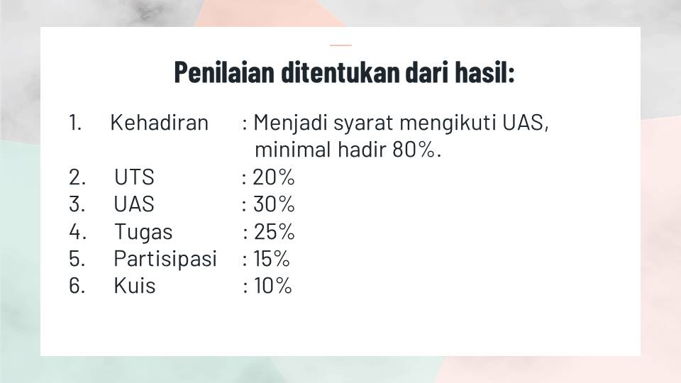 - Mengerjakan tugas, Kuis, UTS, UAS dan mengumpulkannya sesuai kesepakatan dengan tim pengajar kelas, bila tidak dikumpul atau terlambat mengumpulkan tugas maka nilai akhir dinyatakan tidak lulus (E).