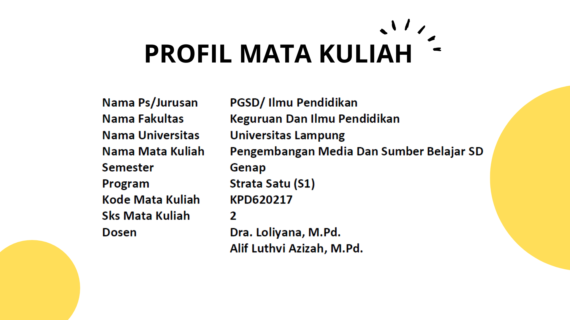 Selamat datang di Mata Kuliah Pengembangan Media dan Sumber Belajar SD Daring FKIP Universitas Lampung. Mata kuliah ini ditujukan bagi peserta didik yang sedang mengambil program strata satu (S1) Sarjana pada rumpun Ilmu Pendidikan, terutama terkait dengan Pendidikan Guru Sekolah Dasar. Mata kuliah ini memiliki beban SKS sebesar 2 SKS, dengan kode Matakuliah: KPD620217.Adapun dosen pengampu mata kuliah ini adalah sebagai berikut: