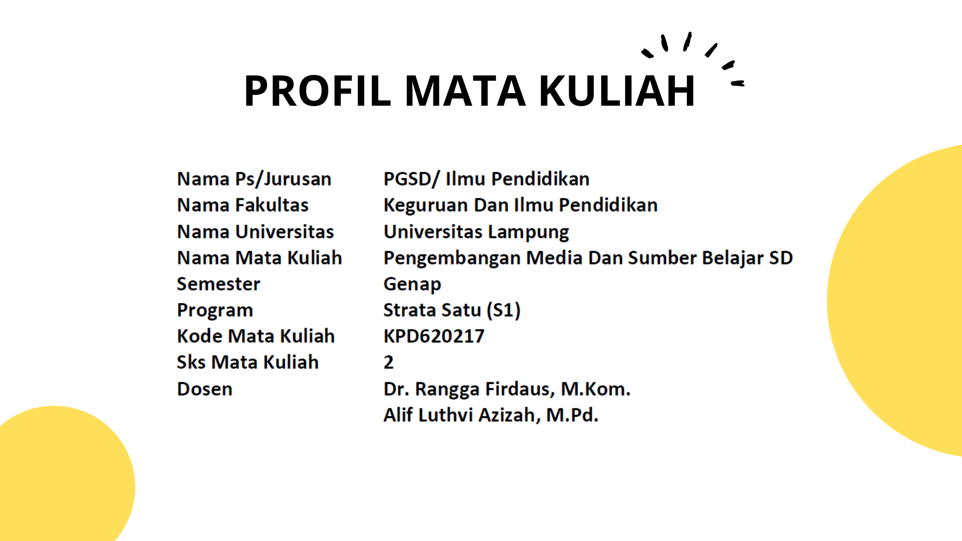 Selamat datang di Mata Kuliah Pengembangan Media dan Sumber Belajar SD Daring FKIP Universitas Lampung. Mata kuliah ini ditujukan bagi peserta didik yang sedang mengambil program strata satu (S1) Sarjana pada rumpun Ilmu Pendidikan, terutama terkait dengan Pendidikan Guru Sekolah Dasar. Mata kuliah ini memiliki beban SKS sebesar 2 SKS, dengan kode Matakuliah: KPD620217.Adapun dosen pengampu mata kuliah ini adalah sebagai berikut:
