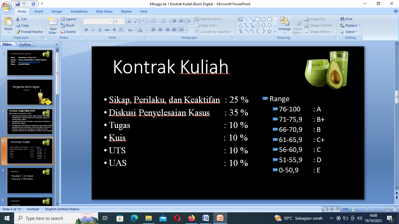 1.Membekali mahasiswa bisnis digital dengan beberapa pengetahuan untuk membantu menavigasi organisasi menuju bisnis digital.2.Mengidentifikasi dan meninjau keputusan manajemen dalam bisnis digital.3.Menggunakan pendekatan integratif yang mengacu pada pendekatan dan model baru termasuk sistem informasi, strategi, pemasaran, keuangan, manajemen rantai pasokan, operasi, dan manajemen sumber daya manusiaMateri Business :