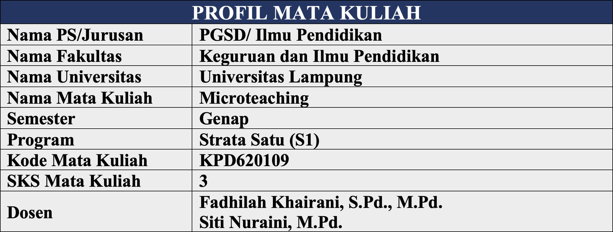 Selamat datang di Mata Kuliah Microteaching Daring FKIP Universitas Lampung. Mata kuliah ini ditujukan bagi peserta didik yang sedang mengambil program strata satu (S1) Sarjana pada rumpun Ilmu Pendidikan, terutama terkait dengan Pendidikan Guru Sekolah Dasar. Mata kuiah Microteaching ini memiliki beban SKS sebesar 3 SKS, dengan kode Matakuliah: KPD620109.