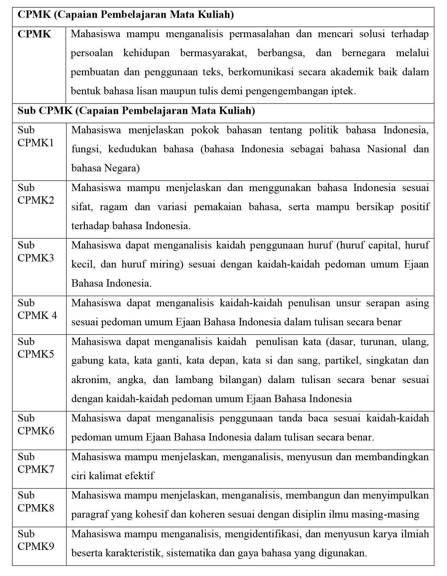 Mahasiswaku sekalian, berikut merupakan capaian pembelajaran mata kuliah (cpmk). Capaian ini menjadi lebih spesifik dibanding capaian sebelumnya. Jika sebelumnya hanya membahas capian lulusan program studi, capaian dalam pembelajaran ini lebih mengarah ke hal apa yang ingin dikuasai mahasiswa setelah mengikuti Mata Kuliah Umum Pendidikan Bahasa Indonesia.