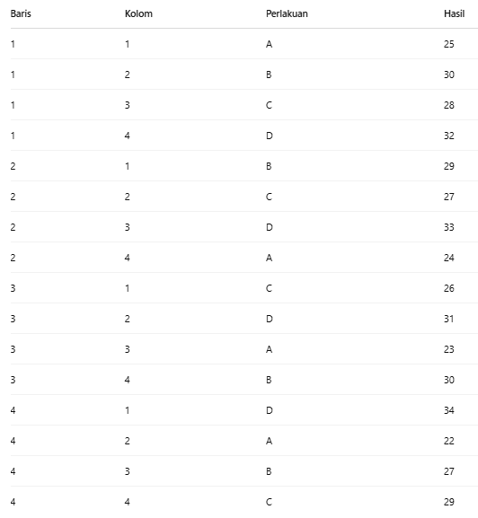 Seorang peneliti ingin mengetahui pengaruh empat jenis pupuk (A, B, C, dan D) terhadap hasil panen tanaman padi (dalam kg per plot). Penelitian dilakukan pada empat jenis tanah dan empat waktu tanam yang berbeda, yang dianggap dapat memengaruhi hasil panen. Untuk mengendalikan pengaruh jenis tanah dan waktu tanam, peneliti menggunakan rancangan Bujur Sangkar Latin (BSL) 4x4. Setiap perlakuan muncul satu kali pada setiap baris dan kolom.