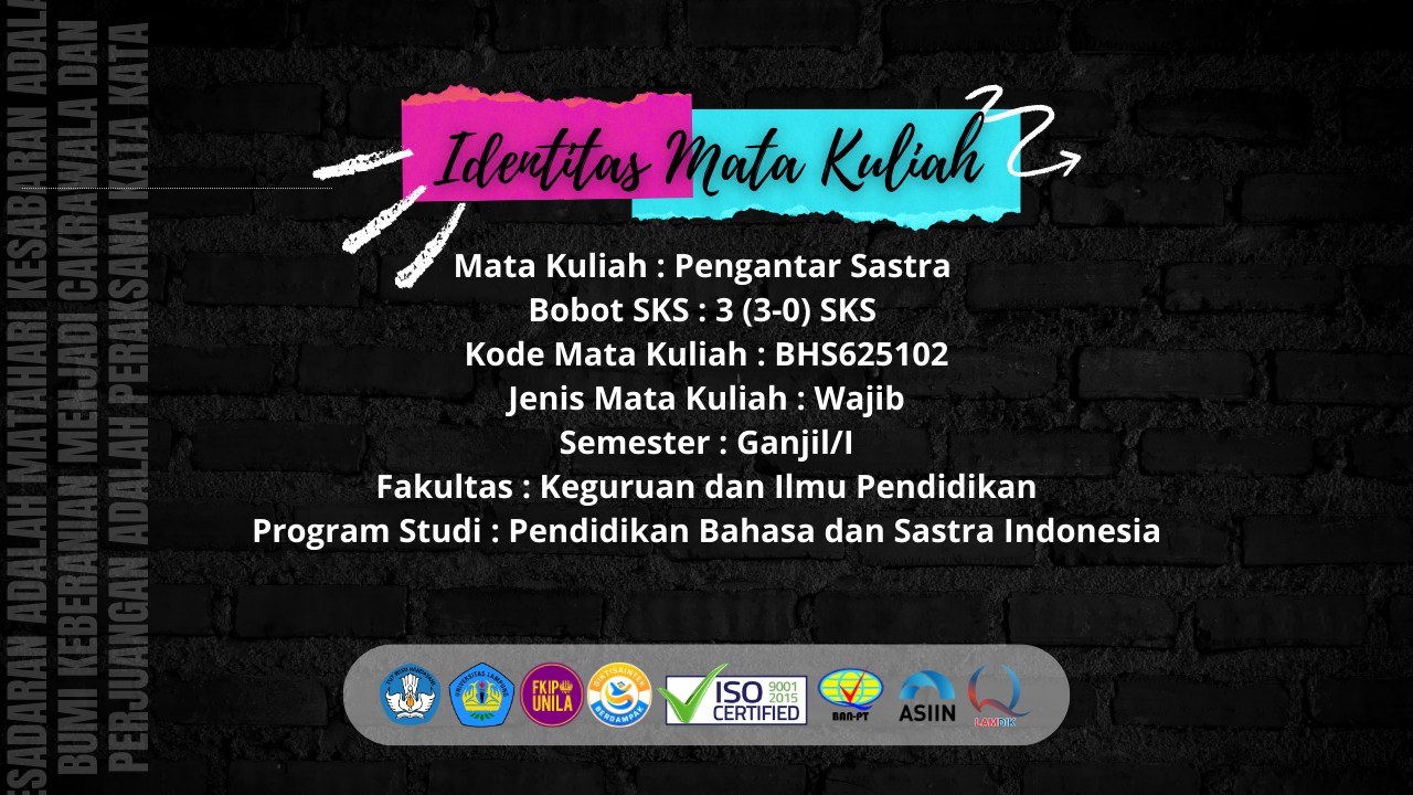 Hallo hallo hallo. Apa kabar rekan-rekan mahasiswa? Apakah Anda masih semangat menyelami mata kuliah Pengantar Sastra? Harusnya sih masih semangat ya. Kita baru saja masuk setengah perjalanan, masa iya harus berhenti. Kita berhenti ketika sudah selesai, karena itulah esensi berjuang. Hingga titik darah penghabisan.