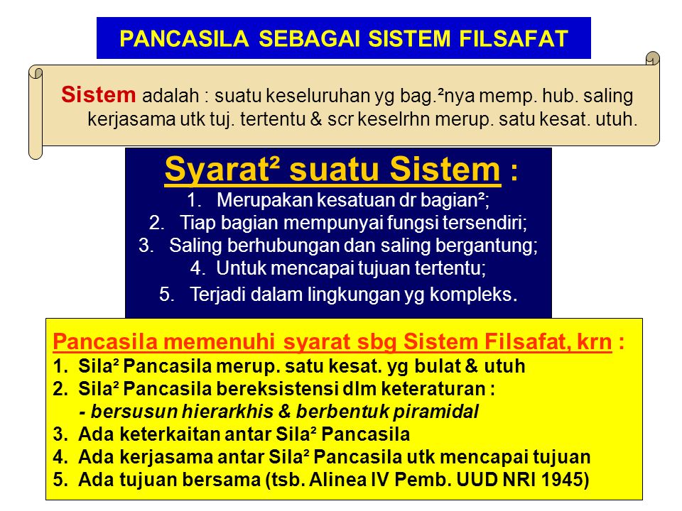 Filsafat merupakan awal dari ilmu pengetahuan, filsafat disebut juga sebagai “Mother of Science”. Pada era pemerintahan Soekarno, Pancasila sebagai sistem filsafat dikenal dengan istilah “Philosofische Grondslag” namun belum diuraikan secara rinci, lebih merupakan adagium politik untuk menarik perhatian anggota sidang, dan bersifat teoritis. Pada era Soeharto, kedudukan Pancasila sebagai sistem filsafat berkembang ke arah yang lebih praktis dengan istilah “weltanschauung”. Artinya, filsafat Pancasila tidak hanya bertujuan mencari kebenaran dan kebijaksanaan, tetapi juga digunakan sebagai pedoman hidup sehari-hari. Pada era reformasi, Pancasila sebagai sistem filsafat kurang terdengar resonansinya. Namun, Pancasila sebagai sistem filsafat bergema dalam wacana akademik.