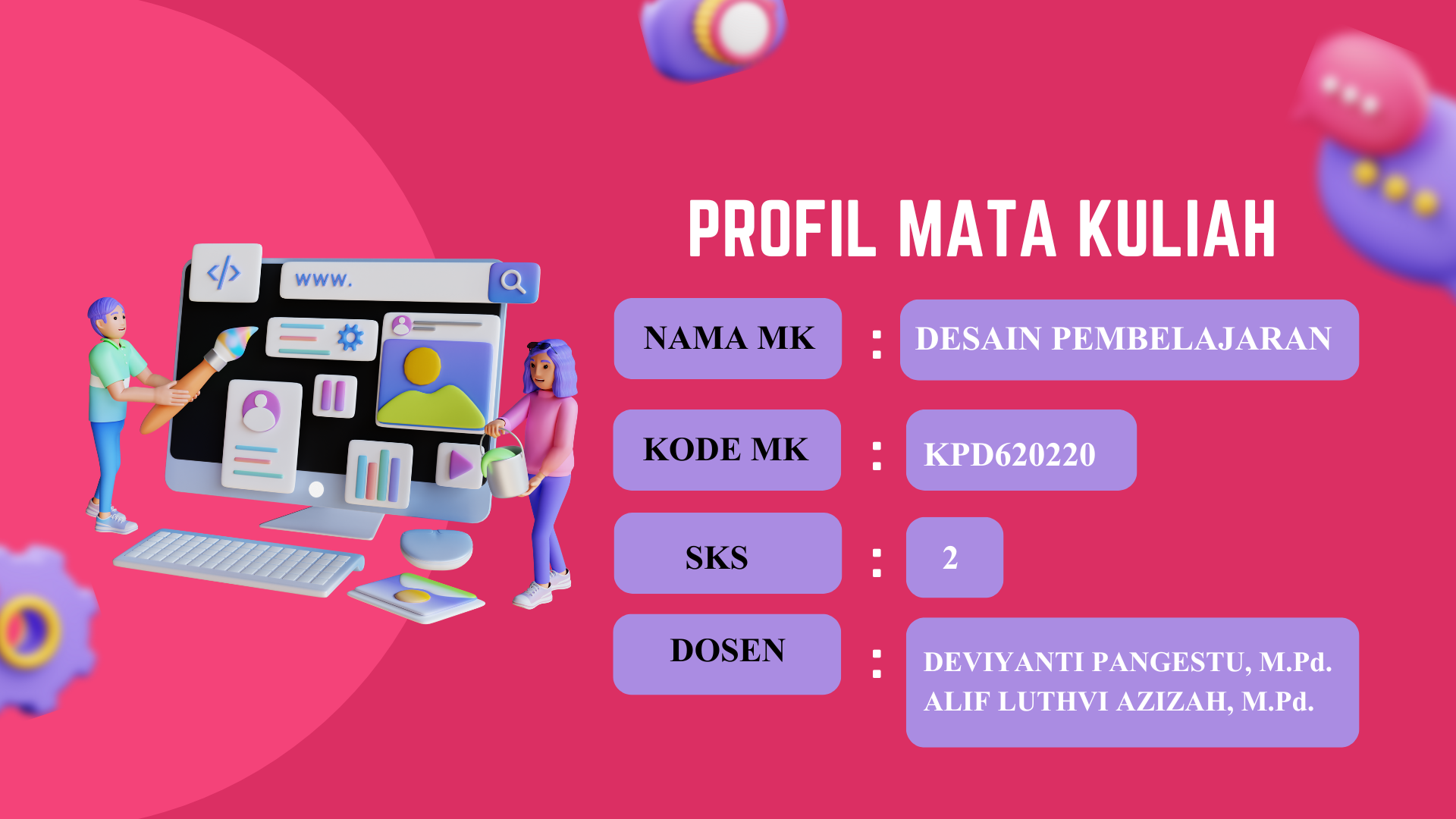 Selamat datang di Mata Kuliah DESAIN PEMBELAJARAN SD FKIP Universitas Lampung. Mata kuliah DESAIN PEMBELAJARAN SD ini memiliki beban SKS sebesar 2 SKS. Semoga Allah memudahkan kegiatan belajar Kita, Aamiin