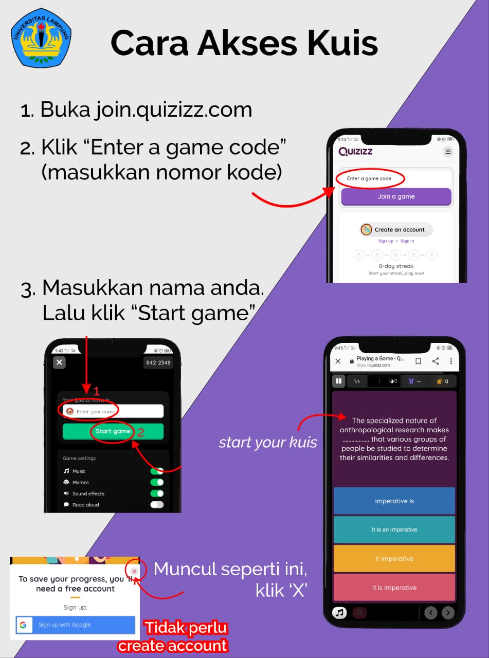 Quizizz (ujian berbasis game online) merupakan web tool untuk membuat permainan kuis interaktif yang digunakan dalam pembelajaran di kelas. Quizizz terdiri dari satu soal dan 4 pilihan jawaban termasuk jawaban benar diantara pilihan tersebut. Pada soal maupun pilihan dapat diberikan gambar sehingga dapat menarik perhatian siswa. Bila soal Quizizz sudah jadi dibuat, maka soal tersebut dapat dibagikan kepada siswa dengan menggunakan 6 digit kode dari Quizizz. Kelebihan dari Quizizz adalah (i) siswa satu dengan yang lainnya tidak dapat mencontek karena soal yang diberikan kepada siswa satu dengan yang lainnya telah diacak; (ii) dapat mengetahui rangking yang didapat dari keseluruhan siswa yang mengerjakan soal tersebut; (iii) mengetahui soal dan jawaban yang betul dari soal yang telah dikerjakannya.