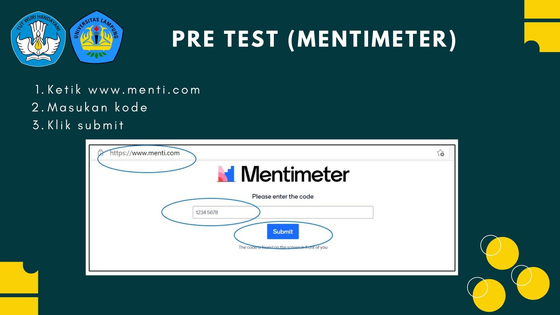 Apliakasi mentimeter di masa pembelajaran atau pelatihan dalam jaringan banyak digunakan sebagai solusi untuk membuat Pre Test sederhana secara online sehingga presentasi yang disampaikan lebih interaktif karena bisa langssung menggali pendapat peserta didik Era Digita 4.0 secara langsung. Mentimeter merupakan salah satu alat untuk bekerja jarak jauh. Mentimeter adalah software presentasi yang mudah digunakan. Dengan mentimeter dapat membuat presentasi yang menyenangkan dan interaktif. Mentimeter membantu menjadikan kegiatan pembelajaran, presentasi, ceramah, dan lokakarya menjadi inovatif dan berkesan. Mentimeter dapat digunakan untuk hal berikut (i) Melibatkan dan berinteraksi dengan siswa atau peserta kegiatan menggunakan polling langsung, (ii) Mengumpulkan umpan balik dari respon peserta untuk terus meningkatkan kualitas pembelajaran atau presentasi yang dilakukan, (iii) Memastikan semua orang mengikuti dan berpartisipasi bahkan dalam rapat online. Langkah menggunakan Mentimeter adalah (i) Ketik www.menti.com, (ii) Masukan kode, dan (iiii) Klik Submit.
