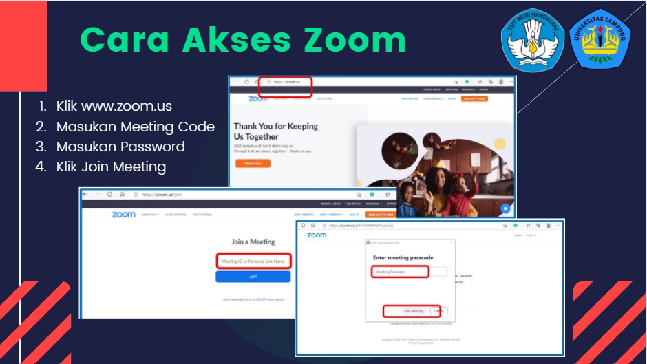 Zoom adalah aplikasi buatan Eric Yuan, yang dirilis pada Januari 2013. Selain aplikasi, Zoom juga dapat diakses melalui website, baik untuk OS Mac, Windows, Linux, iOS, dan Android. Ketika mendaftarkan diri, kamu berada di jenis akun Basic yang memiliki beberapa keuntungan, seperti: (i) Dapat melakukan meeting hingga 100 partisipan, (ii) Gratis 40 menit video conference untuk rapat kelompok, kamu dapat mengulang lagi jika durasi sudah habis, (iii) Kualitas suara dan gambar HD, (iv) Screen-sharing, (v) Akses ke virtual background, (vi) Menjadwalkan hingga merekam keseluruhan meeting, (vii) Membagi partisipan menjadi beberapa “ruangan” dengan fitur Breakout Rooms. Cara akses Zoom, yaitu (i) Klik www.zoom.us, (ii) Masukan Meeting Code, (iii) Masukan Password, dan (iv) Klik Join Meeting.
