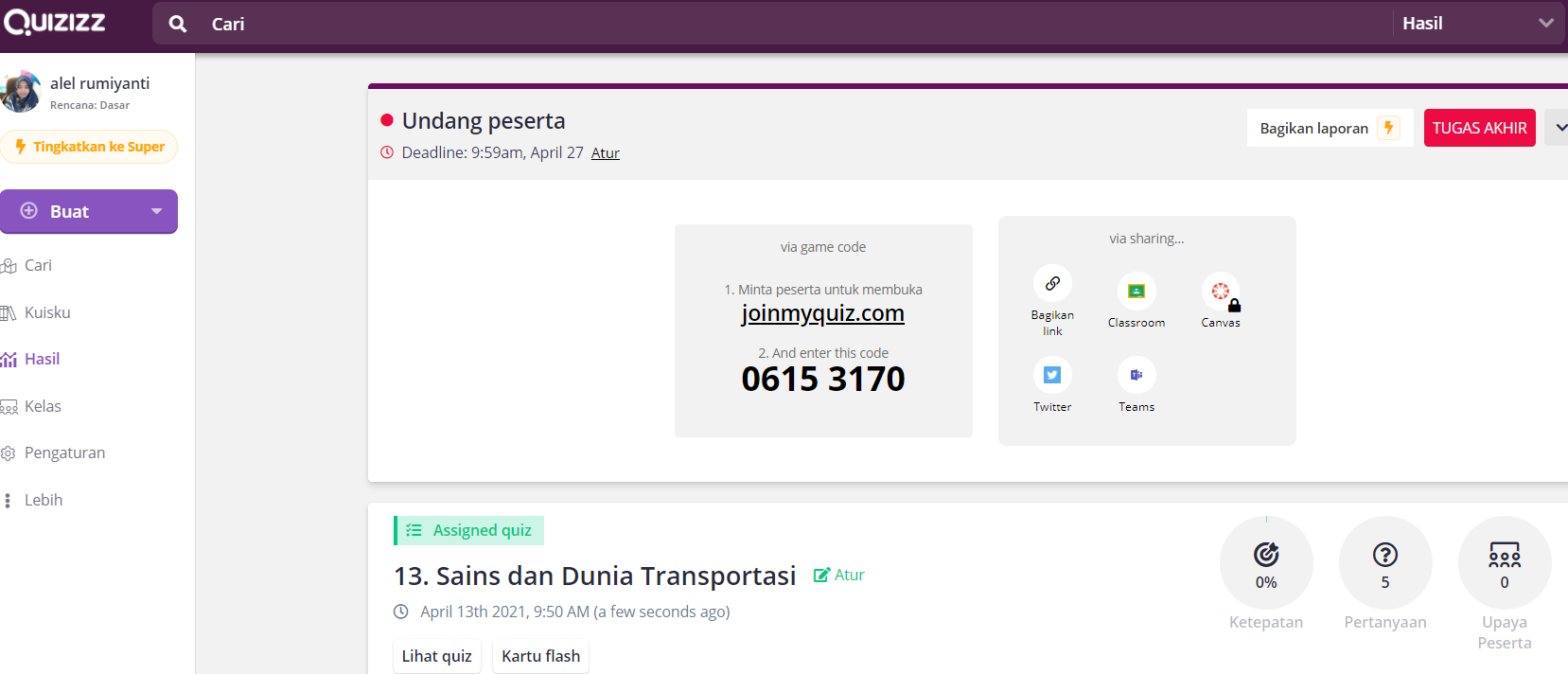 Mohon dipastikan peserta didik Generasi Millennial Era Digital 4.0 melaksanakan setiap tahapan dalam Pertemuan Ketiga belas Mata Kuliah Basic Science secara sistematis agar dapat menjawab tantangan berupa soal yang disajikan melalui Quizizz untuk melihat seberapa besar pemahaman  peserta didik Generasi Millennial Era Digital 4.0 terhadap Sejarah Sains. Tantangan didesain terdiri atas 20 soal dengan berbagai tipe soal yang mampu mengasah kemampuan Mengingat (C1),  Memahami (C2), Mengaplikasikan (C3), Menganalisis (C4), dan Mengevaluasi (C5) menurut Taksonomi Bloom yang dilengkapi dengan gambar dan musik menarik sehingga peserta didik Generasi Millennial Era Digital 4.0 dalam mengerjakannya secara optimal. Peserta didik Generasi Millennial Era Digital 4.0 juga diberikan tugas berupa soal essay yang terdiri atas empat soal agar Skill pada abad 21, yakni Problem Solving, Critical Thinking, Creativity, & Emotional Intelligence dapat dikuasai dengan baik.