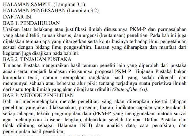 - Karya Tulis Ilmiah berisikan (i) Pendahuluan (Latar Belakang, Rumusan Masalah, Tujuan khusus dan Urgensi Penelitian); (ii) Tinjuan Pustaka (minimal 5 dengan waktu 10 tahun terakhir); (iii) Metode Penelitian (Tempat dan waktu penelitian, Tahapan penelitian, Bagan Alir); (vi) Daftar Pustaka