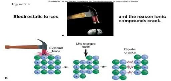karena ada nya gaya yang cukup untuk menggeser sedikit ion-ion sehingga panjang ikatan menjadi memendek separohnya maka gaya yang semula tarik-menarik akan berubah menjadi gaya tolak-menolak karena kontak antar anion dan antar kation menjadi lebih signifikan. Akibtanya, kristal menjadi mudah terpecah-belah, berikut saya lampirkan gambar nya