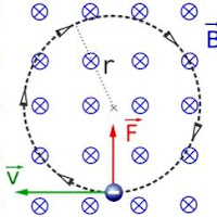 Izin mencoba menjawab mba Eva, gaya Lorentz pada muatan bergerak dalam medan magnet itu jika arah medan magnet tegak lurus dengan arah kecepatan partikel bermuatan listrik, maka lintasannya akan berbentuk lingkaran sehingga partikel akan mengalami gaya sentripetal yang besarnya sama dengan gaya Lorentz.