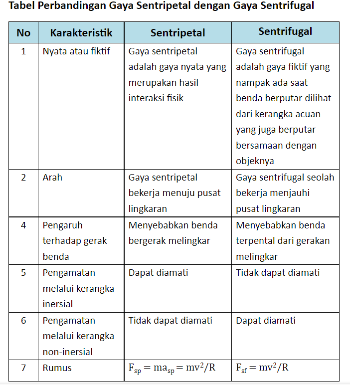 Izin menjawab, berdasarkan informasi yang saya baca gaya sentripetal adalah gaya yang mengarah ke dalam (pusat gerak melingkar), sedangkan gaya sentrifugal adalah gaya yang mengarah ke luar pusat gerak melingkar. Arah gaya sentrifugal selalu menjauhi pusat lingkaran dan gaya ini memiliki fungsi untuk mengimbangi gaya sentripetal sehingga benda yang bergerak melingkar dalam keadaan seimbang. Gaya ini termasuk efek semu yang terjadi ketika benda melakukan gerakan melingkar. Gaya sentrifugal disebut dengan gaya pseudo atau gaya khayal