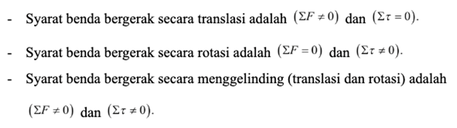 ~ Syarat benda bergerak secara translasi adalah ( ΣF ≠ 0) dan ( Στ = 0)