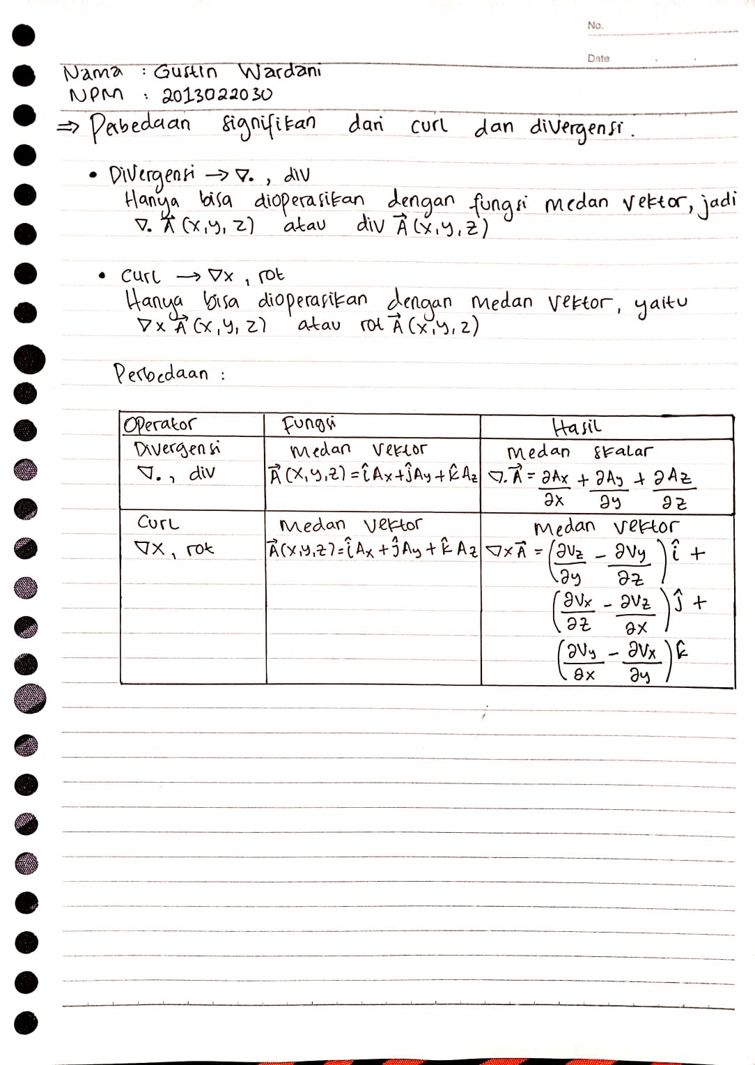 perbedaan signifikan dari curl dan divergensi yaitu divergensi mengubah fungsi vektor menjadi fungsi skalar, adapun penerapannya yaitu divergensi dapat digunakan untuk menghitung Volume gas dalam balon udara. sedangkan curl menyatakan bahwa laju perubahan bidang tergantung pada rotasi bidang kedua, penerapan curl dalam kehidupan sehari-hari yaitu dapat dilihat pada kecepatan kincir angin yang selalu konstan.