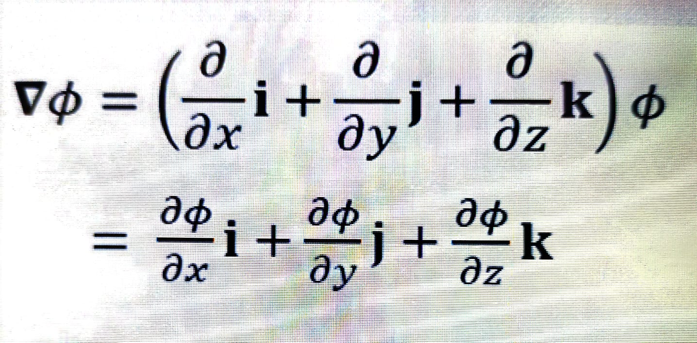 Teorema gradiensi, yaitu dimana Vektor diferensial disajikan dengan operator delta disimboliskan dengan ∇ dan operator delta didefinisikan pengertian gradien suatu fungsi skalar φ(x,y,z). Teorema ini terdefinisi dan diferensiabel pada setiap titik dalam ruang R3.