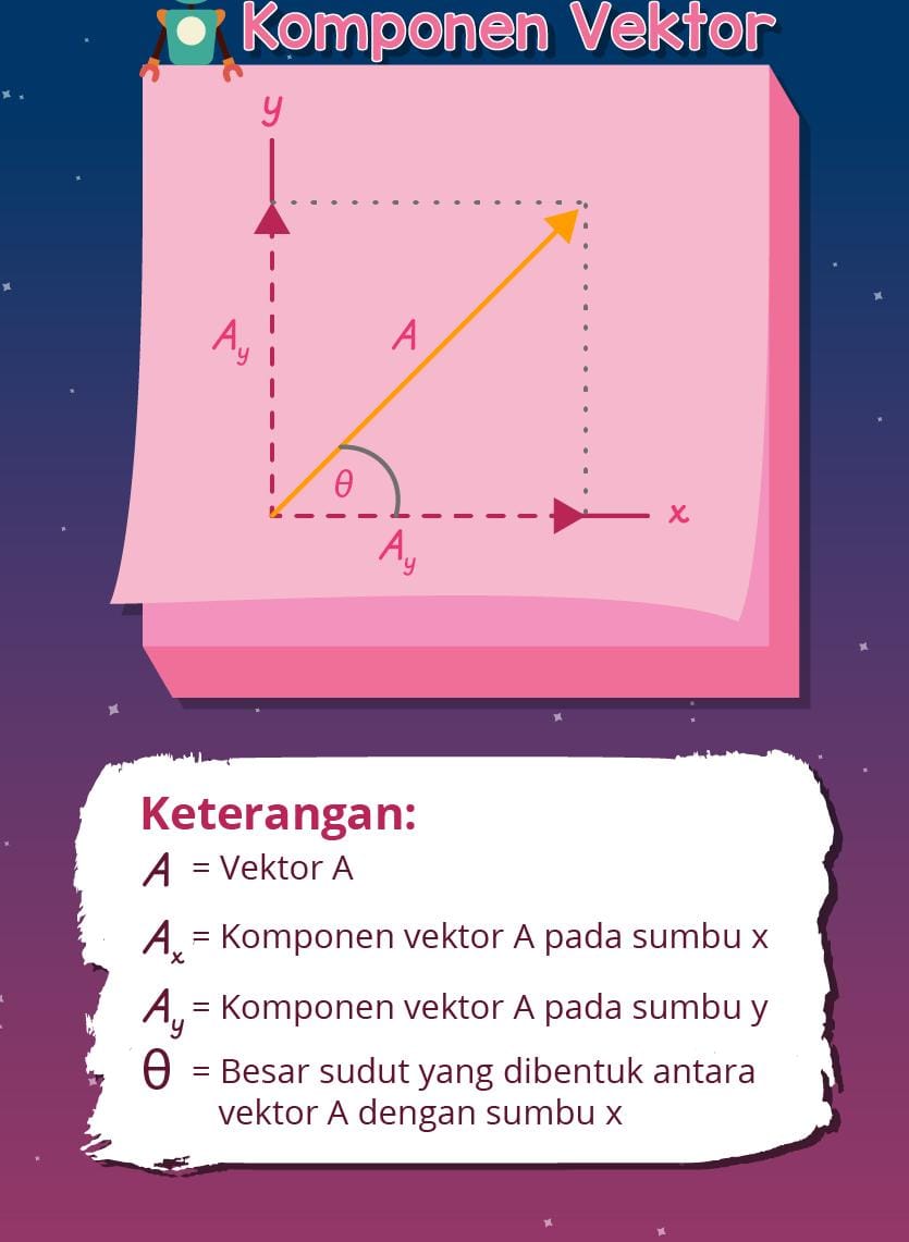 komponen vektor merupakan bayangan dari vektor di suatu sumbu kartesius. Setiap vektor yang membentuk sudut selalu dapat diuraikan menjadi dua buah vektor yang tegak lurus. Vektor pertama terletak pada sumbu x, dapat disebut dengan vektor komponen pada sumbu x. Komponen vektor merupakan sebuah proyeksi terhadap sumbu – sumbu kartesius yaitu sumbu x, y ataupun sumbu z yang ada didekatnya. Atau bayangan dari vektor di suatu sumbu kartesius. Setiap vektor yang membentuk sudut, selalu bisa menjadi dua buah vektor yang tegak lurus.